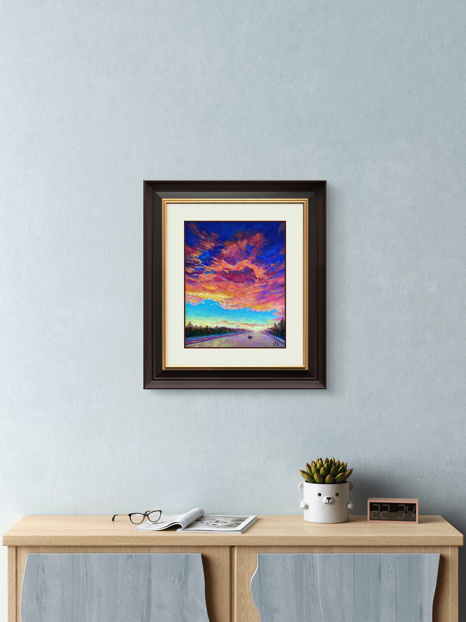 A single traveler moves along a glistening road beneath a sky ablaze with emotion. The fiery clouds, painted in hues of magenta, gold, and violet, seem alive—echoing both solitude and strength. Every brushstroke captures the quiet courage of moving forward when the world feels vast and unknown.
