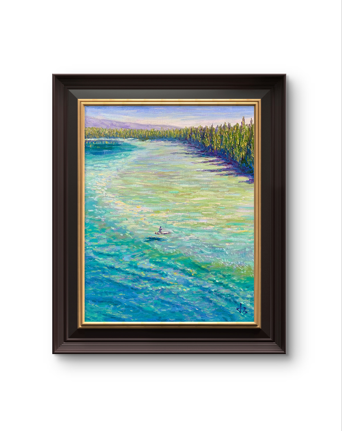 In Emerald Calm, light drifts gently across the surface of a tranquil river, painting it in layers of blue, green, and soft gold. A lone figure glides through the still water, merging into the rhythm of nature—a moment suspended between movement and stillness. The brushstrokes shimmer like ripples, each one alive with subtle energy and peace.