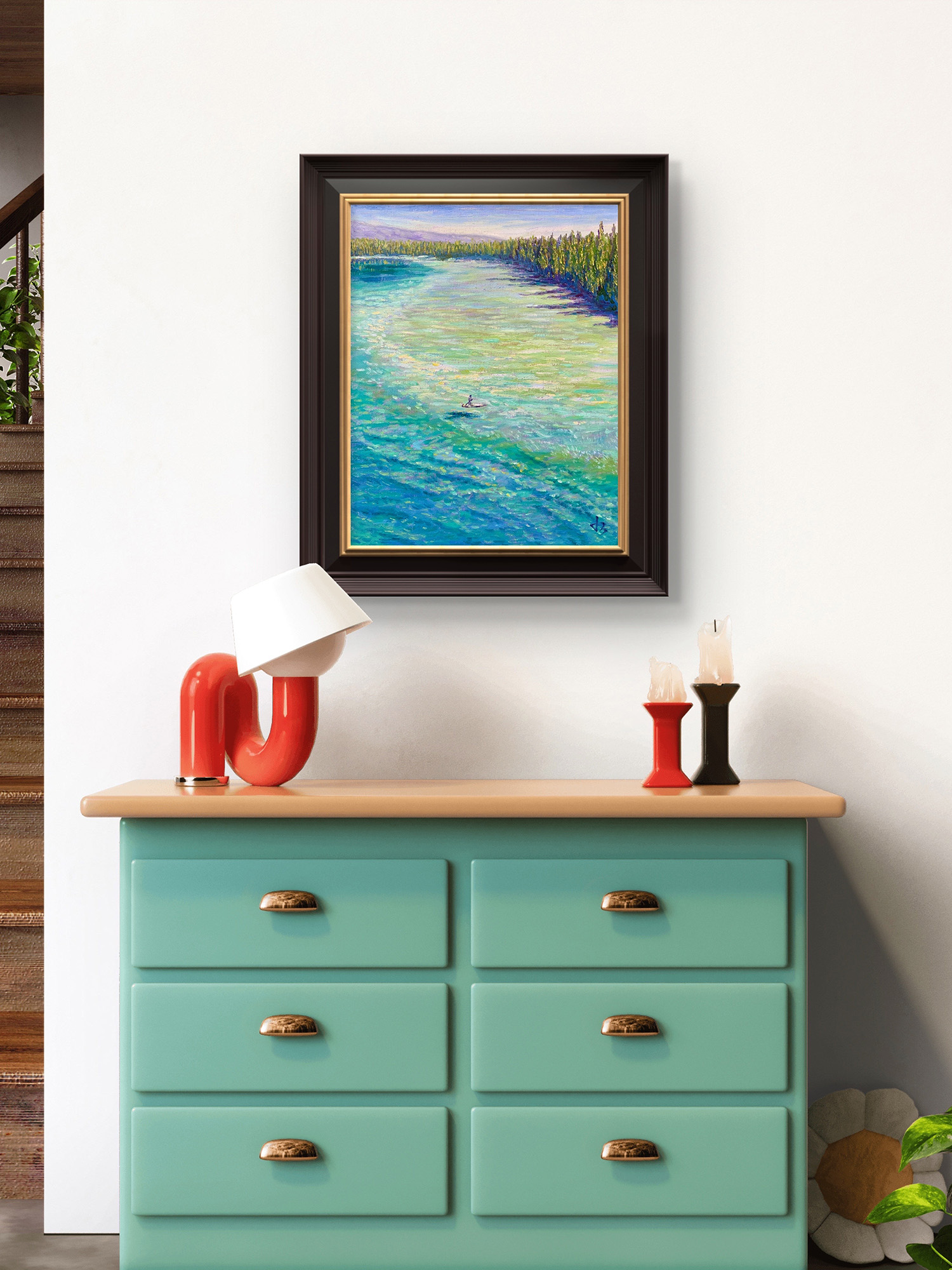 Ideal for spaces that invite contemplation, this work radiates a soothing atmosphere of light and renewal. Let it bring to your home the tranquil depth of water and the timeless calm of nature’s embrace.