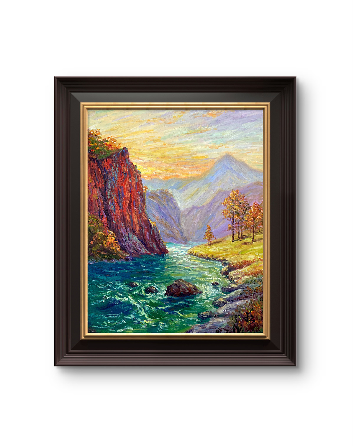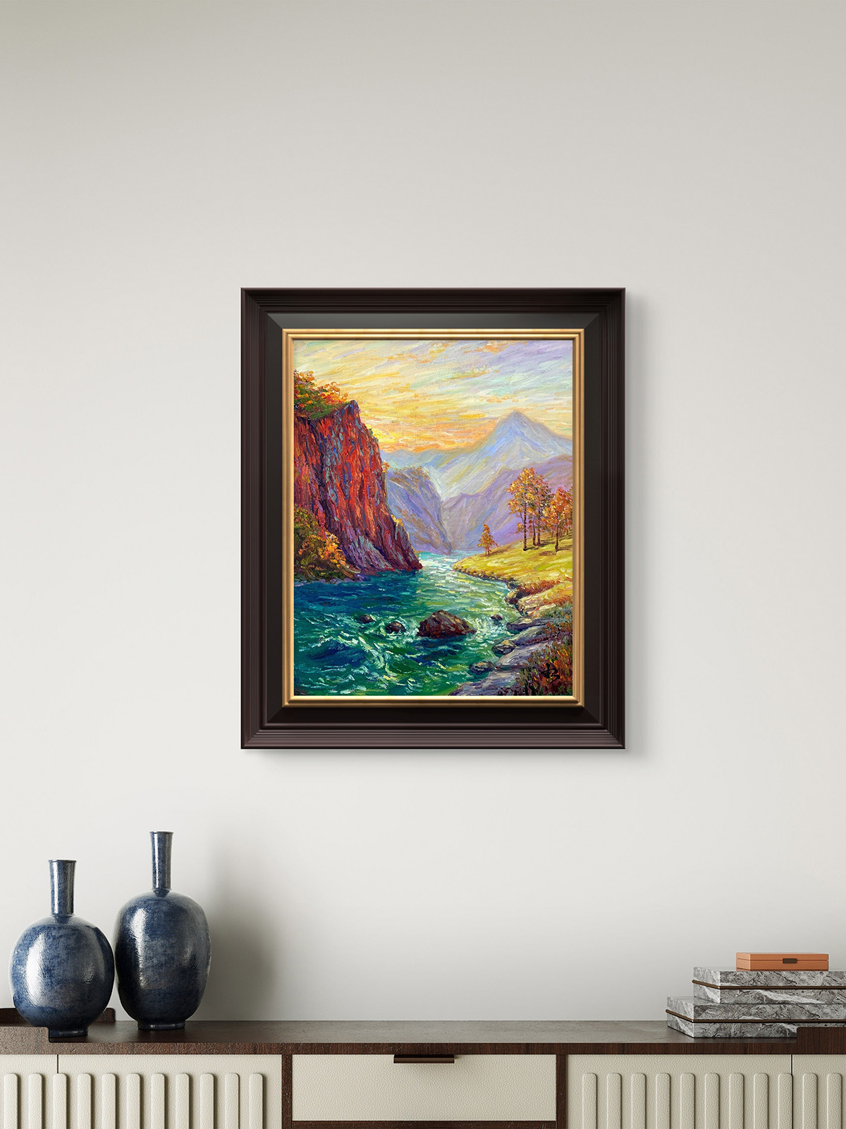Each brushstroke captures the pulse of nature—the strength of water carving its way through stone, and the tenderness of light softening its edges. Glow Over the Gorge is both a landscape and a meditation, an invitation to pause and feel the quiet rhythm that connects all things.