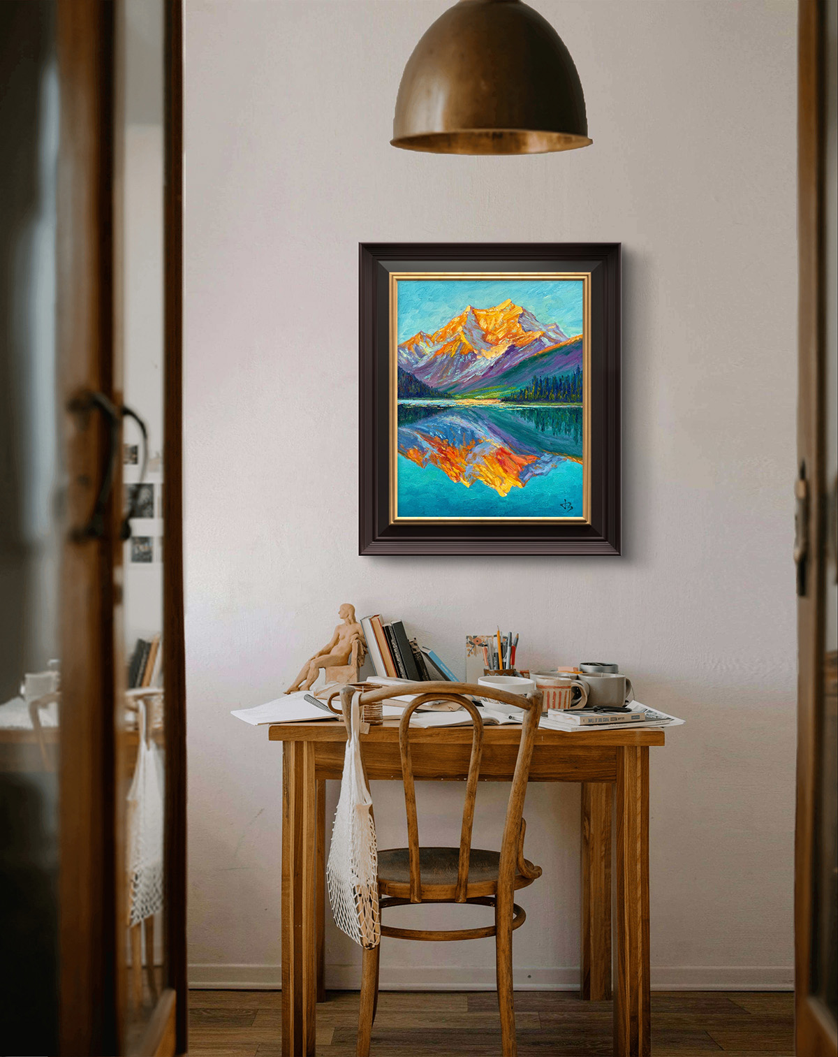The Rocky Mountains glow in golden sunset, mirrored on a tranquil lake. A timeless landscape of strength and peace, this painting brings nature’s warmth and quiet brilliance into your home.