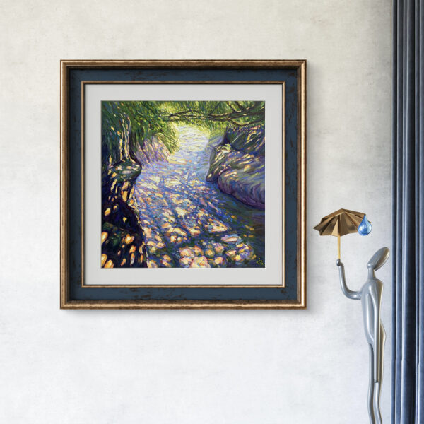 • Golden Reflections — Dallas Deng landscape oil painting, light and calm.Golden Reflections — Dallas Deng oil painting, interior wall view, light and calm.