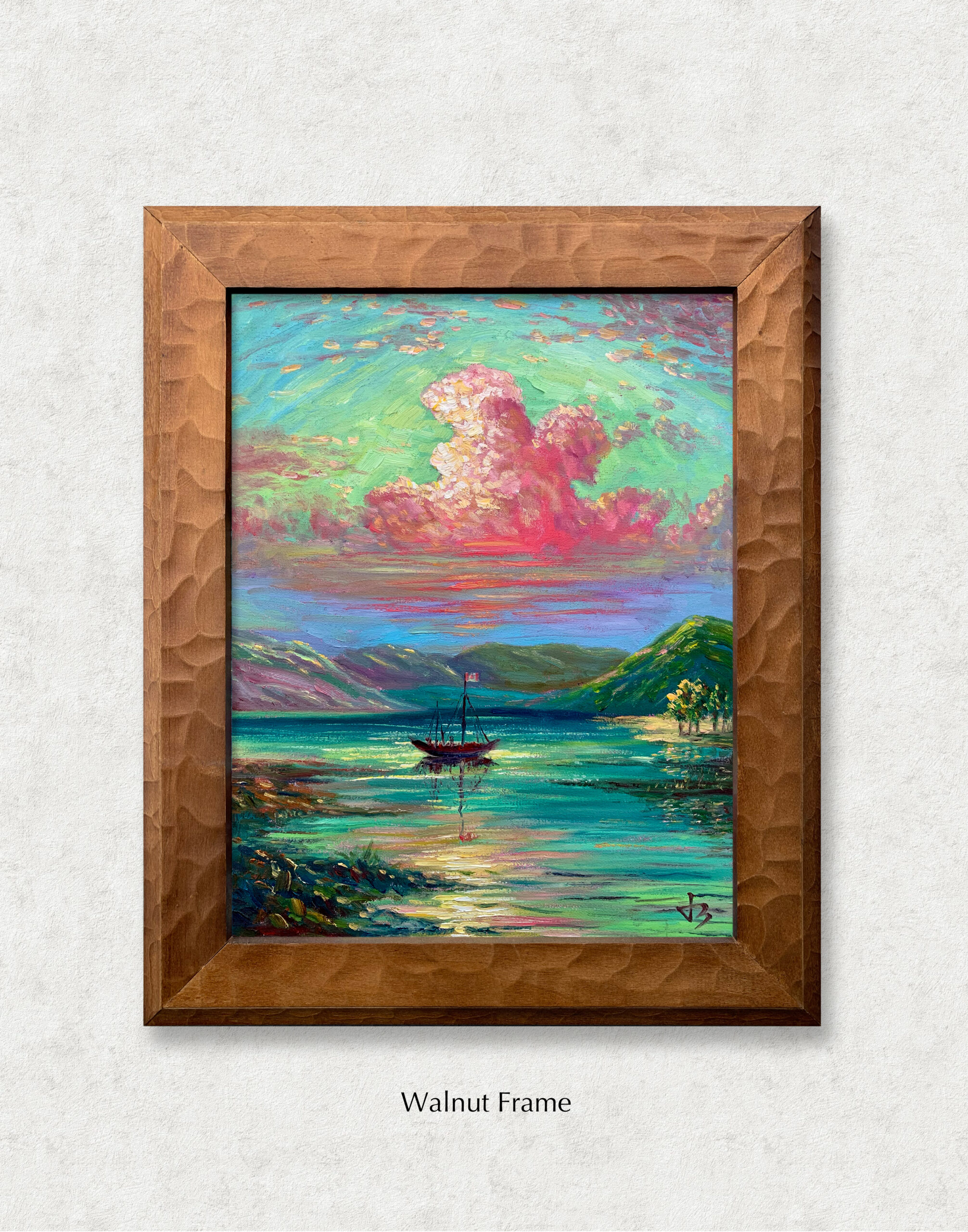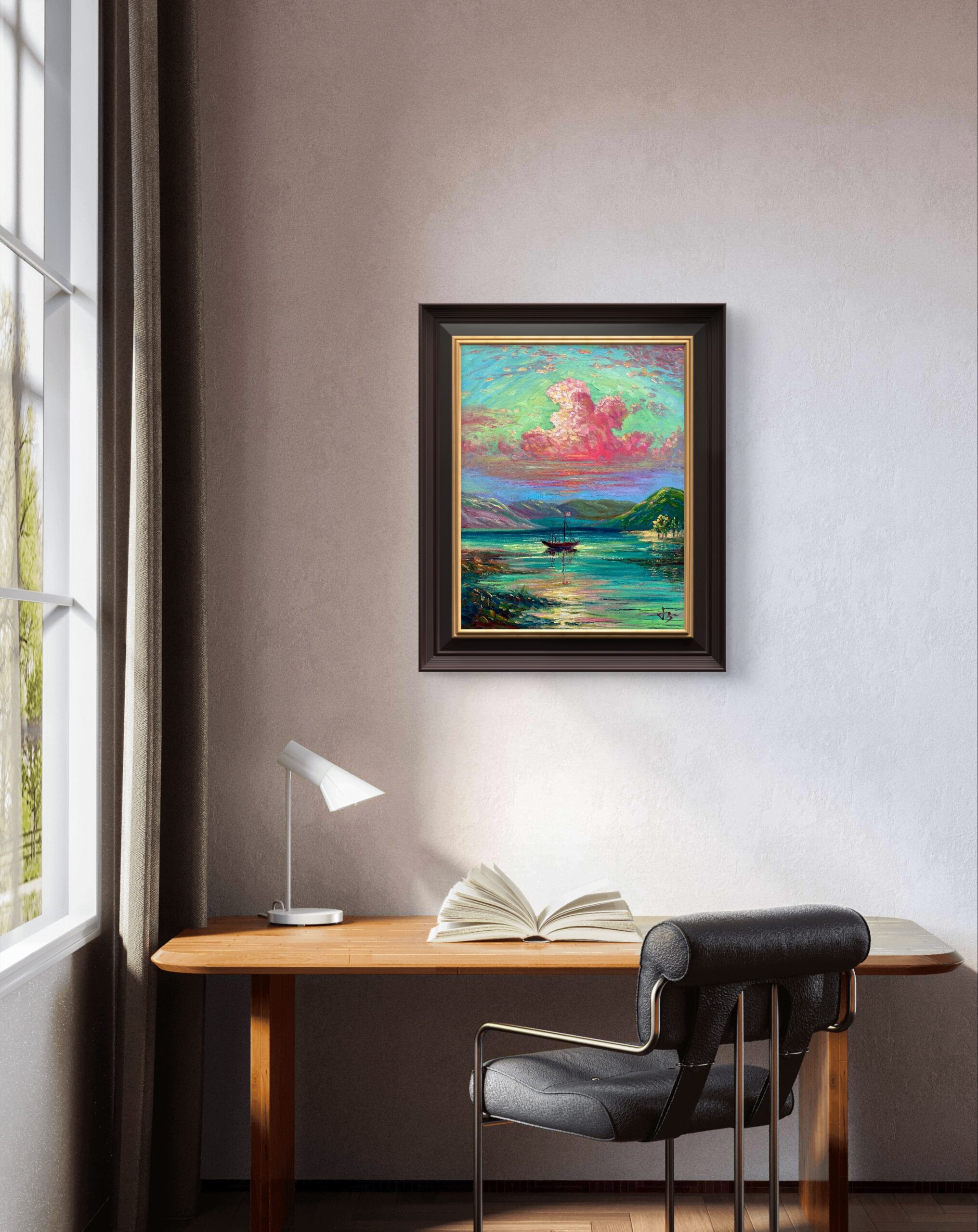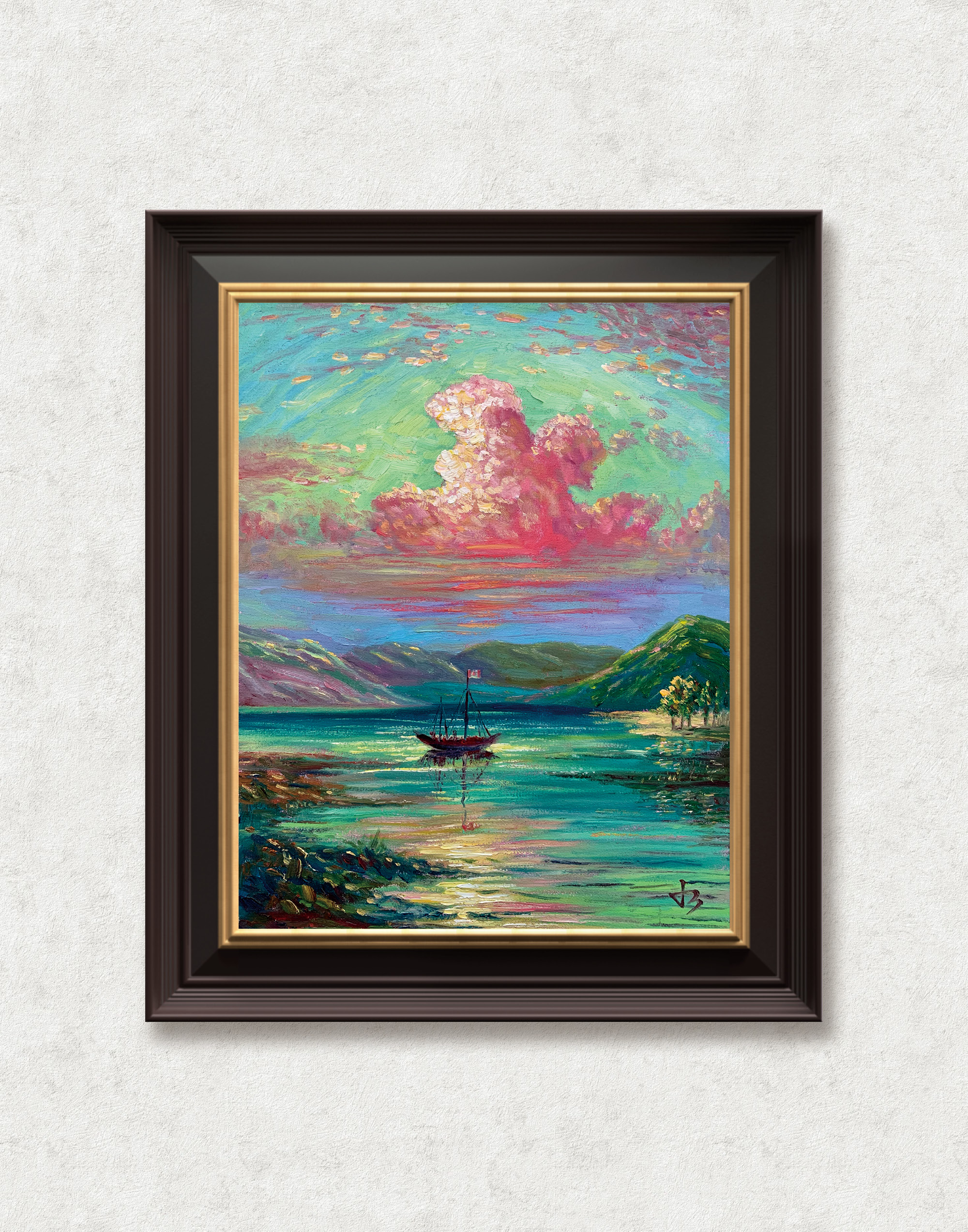 细腻的笔触将旅途的宁静化为温度。橙、金与紫在画布上交织,如时间的呼吸。那是一种回望的情绪——平和而安然。